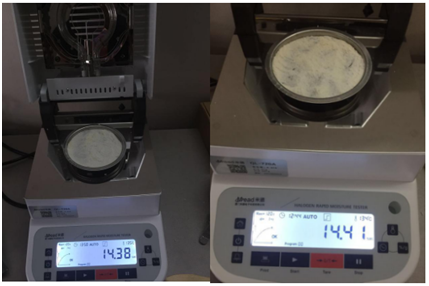 測(cè)試樣品:取5克大米,用粉碎機(jī)打成粉末狀,置于不銹鋼托盤中平鋪均勻,溫度設(shè)置120℃用儀器進(jìn)行加熱,約12分鐘后檢測(cè)結(jié)束,檢測(cè)數(shù)據(jù)顯示14.38%;