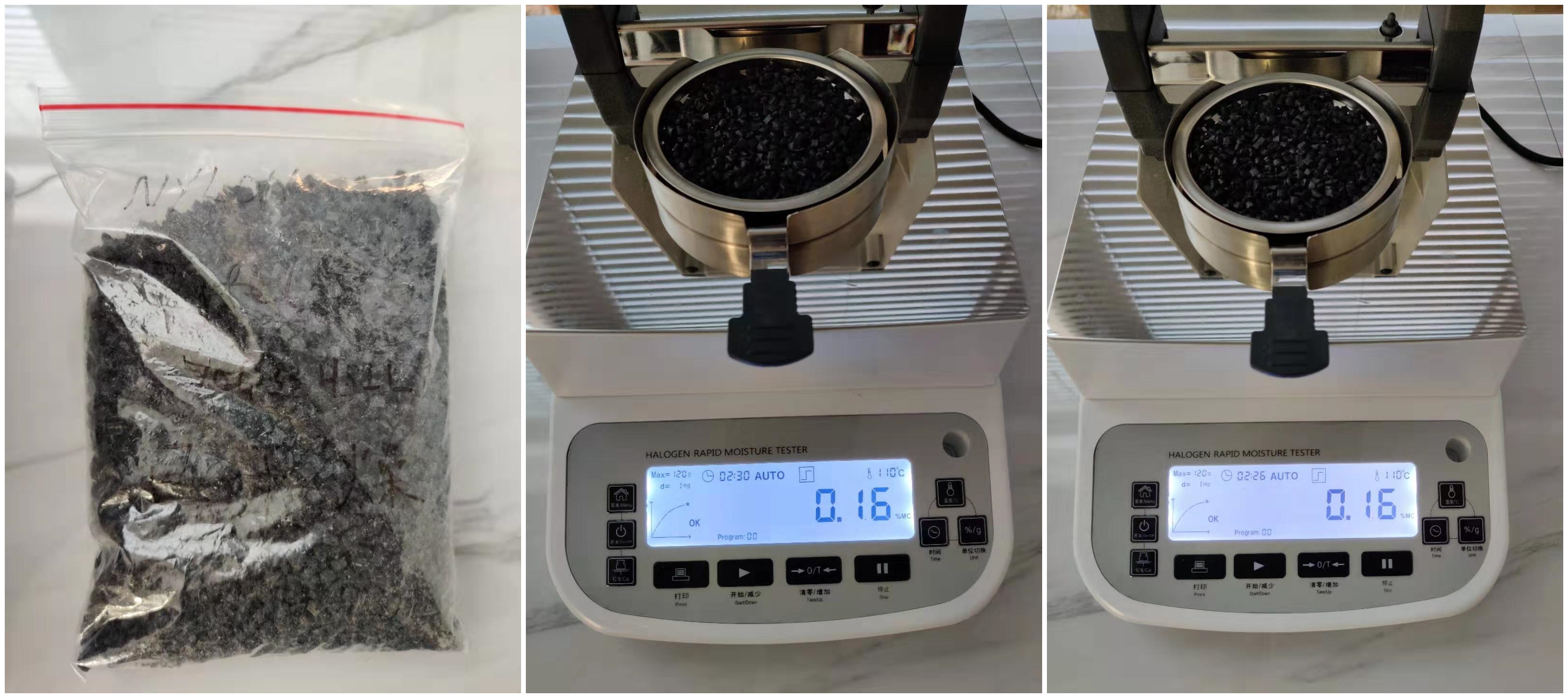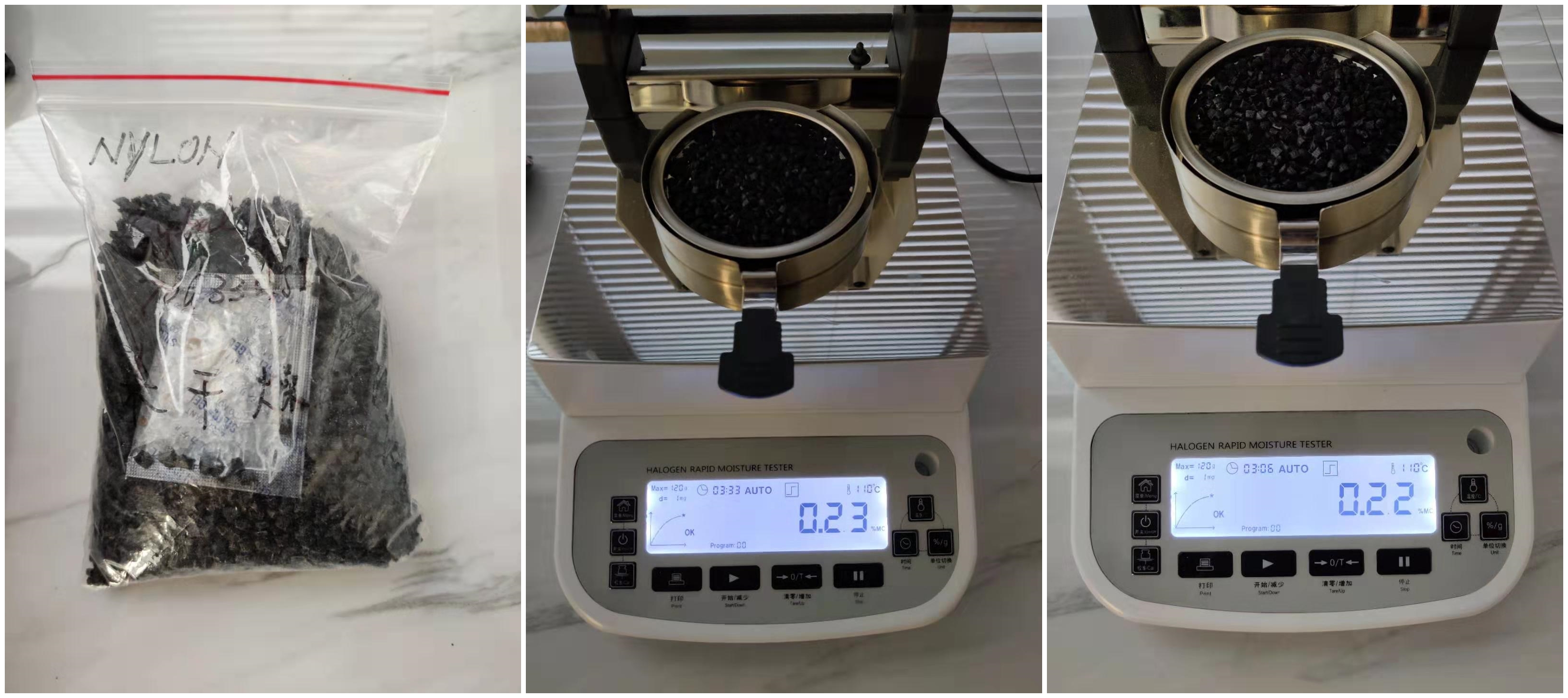 - 重復(fù)步驟3/4,測(cè)試未烘干的尼龍顆粒水分分別為0.23%、0.22%。